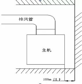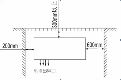 ·上面有障碍物时,需加排风管将冷气排走(如右图);多台并排放置时,机组间需保持一定间距,建议大于1M