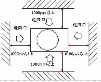 ·安装位置应确保进出风口畅通无阻(进出风口如下图所示),要确保下图中箭头方向所示的离障碍物之间距离。